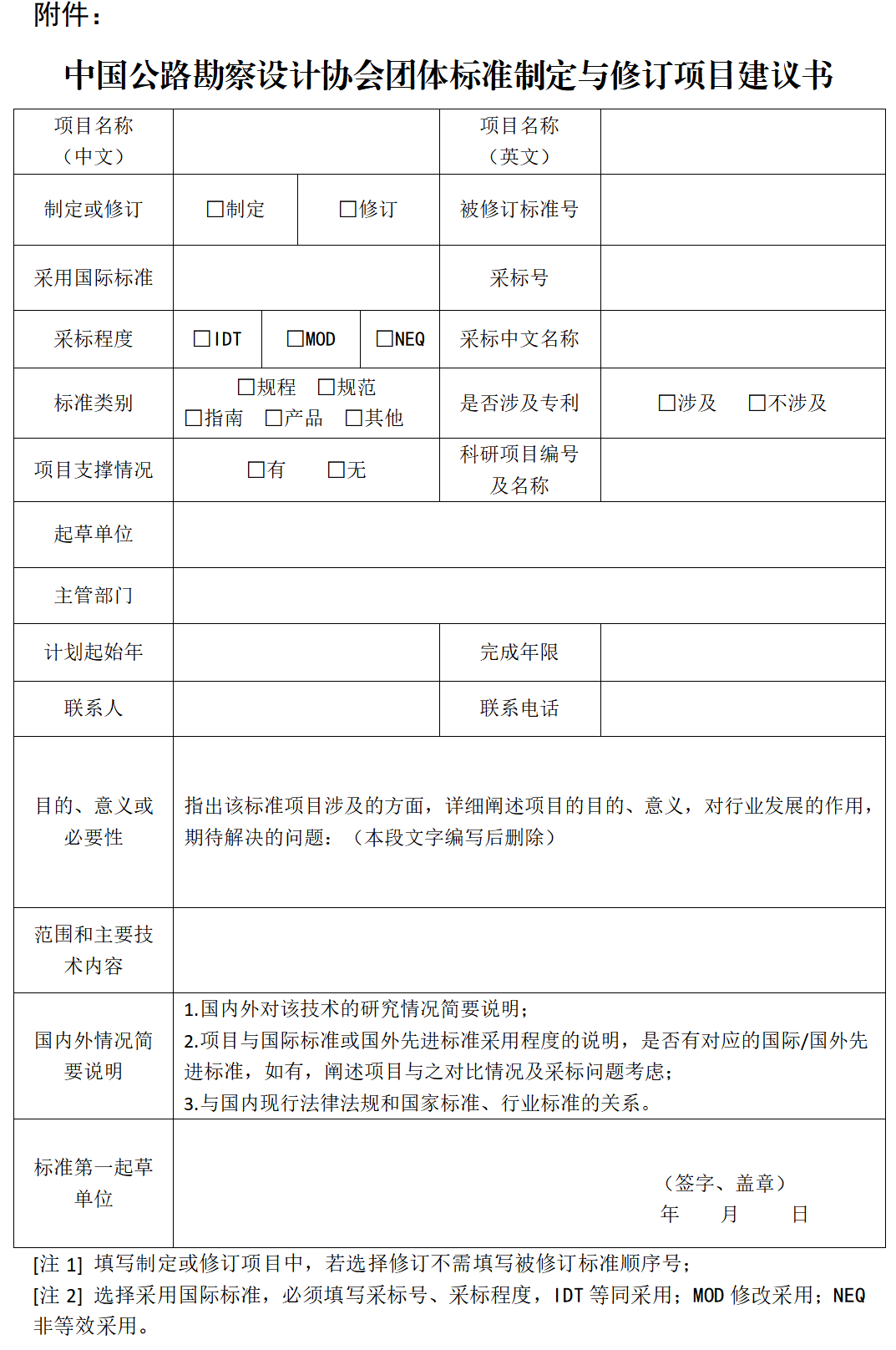 附件:《中國公路勘察設(shè)計(jì)協(xié)會團(tuán)體標(biāo)準(zhǔn)制定與修訂項(xiàng)目建議書》