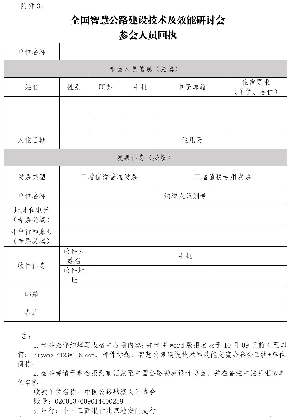 會(huì)期兩天,參會(huì)代表每人繳納會(huì)務(wù)費(fèi)1800元。會(huì)議期間食宿統(tǒng)一安排,交通和住宿費(fèi)用自理。請(qǐng)將會(huì)務(wù)費(fèi)匯至中國(guó)公路勘察設(shè)計(jì)協(xié)會(huì)并注明匯款單位名稱。