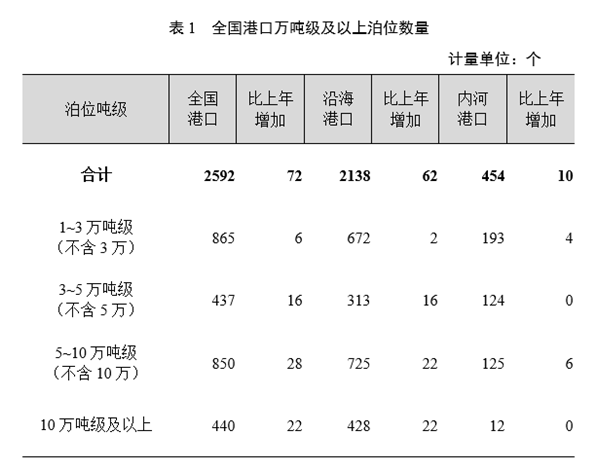 年末全國(guó)港口萬(wàn)噸級(jí)及以上泊位2592個(gè),比上年末增加72個(gè)。其中,沿海港口萬(wàn)噸級(jí)及以上泊位2138個(gè),增加62個(gè);內(nèi)河港口萬(wàn)噸級(jí)及以上泊位454個(gè),增加10個(gè)。