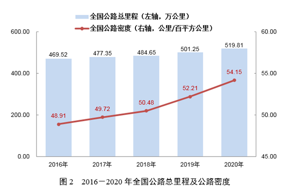 年末全國(guó)公路總里程519.81萬(wàn)公里,比上年末增加18.56萬(wàn)公里。公路密度54.15公里/百平方公里,增加1.94公里/百平方公里。公路養(yǎng)護(hù)里程514.40萬(wàn)公里,占公路總里程99.0%。