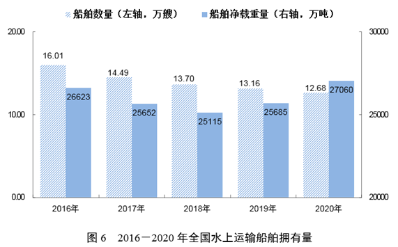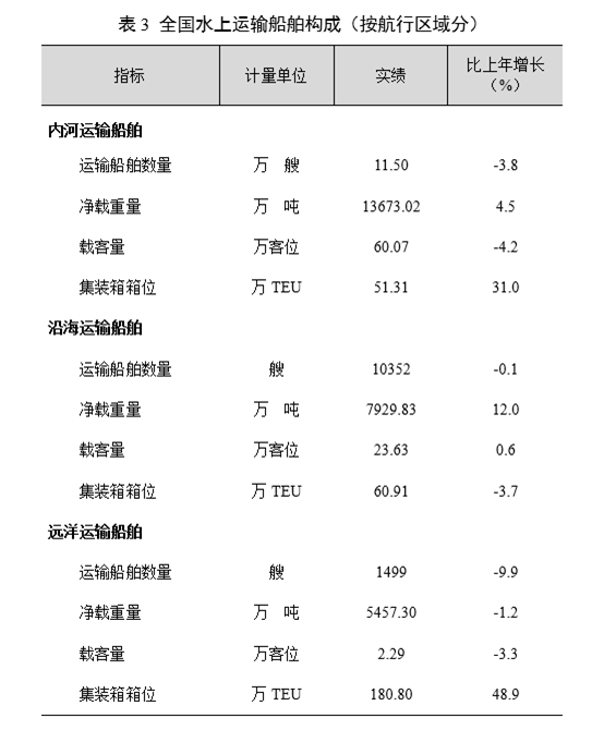 年末全國(guó)擁有水上運(yùn)輸船舶12.68萬(wàn)艘,比上年末下降3.6%;凈載重量27060.16萬(wàn)噸,增長(zhǎng)5.4%;載客量85.99萬(wàn)客位,下降2.9%;集裝箱箱位293.03萬(wàn)標(biāo)準(zhǔn)箱,增長(zhǎng)30.9%。