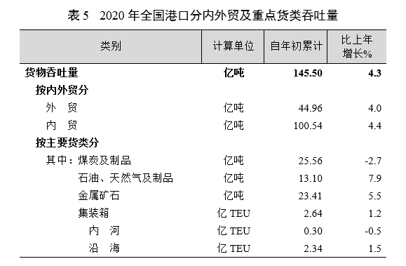 全國(guó)港口完成貨物吞吐量145.50億噸,比上年增長(zhǎng)4.3%。其中,內(nèi)河港口完成50.70億噸,增長(zhǎng)6.4%;沿海港口完成94.80億噸,增長(zhǎng)3.2%。完成集裝箱鐵水聯(lián)運(yùn)量687萬(wàn)TEU,增長(zhǎng)29.6%。