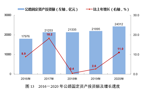 全年完成公路固定資產(chǎn)投資24312億元,比上年增長(zhǎng)11.0%。其中,高速公路完成13479億元,增長(zhǎng)17.2%;普通國(guó)省道完成5298億元,增長(zhǎng)7.6%;農(nóng)村公路完成4703億元,增長(zhǎng)0.8%。