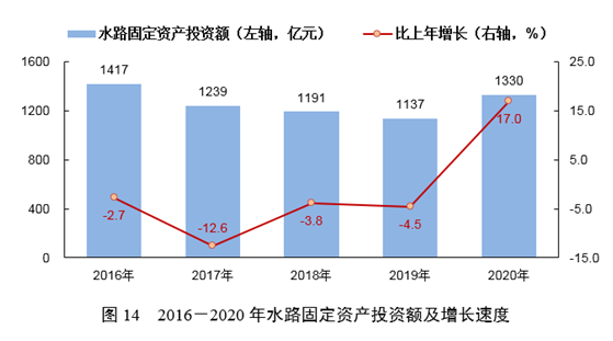 全年完成水路固定資產(chǎn)投資1330億元,比上年增長(zhǎng)17.0%。其中,內(nèi)河完成704億元,增長(zhǎng)14.8%;沿海完成626億元,增長(zhǎng)19.5%。