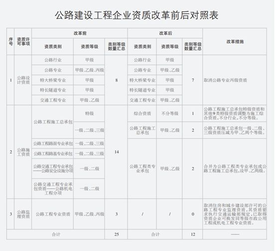 《改革方案》直接取消了住房和城鄉建設部門許可的公路、水運、水利等專業監理資質,明確上述專業資質執行行業主管部門規定;已取得住房和城鄉建設部門許可的公路工程專業監理資質的,可換發同等級市政公用工程或機電工程專項資質。改革后,解決了重復審批問題,由交通運輸部對公路工程監理企業資質進行統籌管理,是建設高效規范的公路監理市場的充分體現,對于公路監理企業是一個極大的利好,真正讓公路監理企業享受到改革的成果。